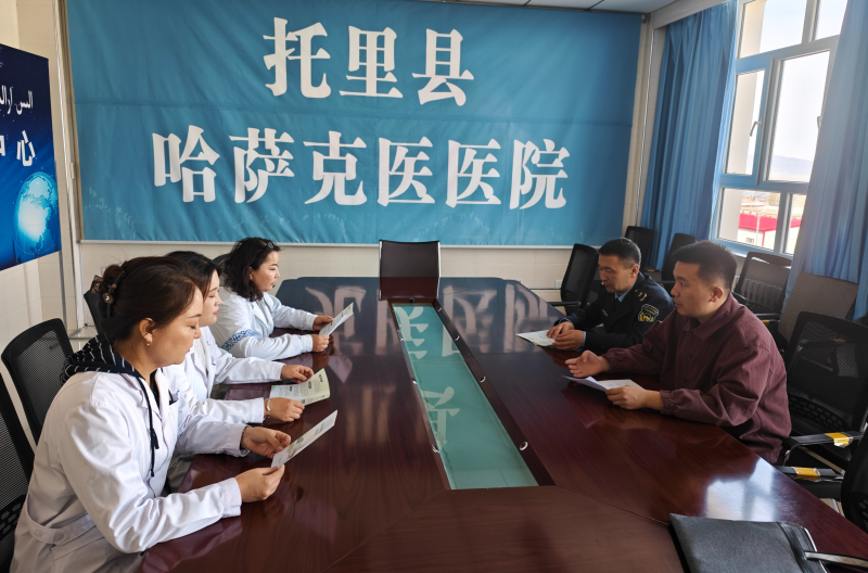 工作人员在托里县哈萨克医医院开展辐射安全法规宣讲与专项检查。
