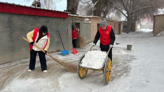 社区工作人员、志愿者来到辖区独居老人奴尔扎海·拉马扎的家中清扫积雪。他们不畏严寒、分工协作,有的用推雪板奋力推除积雪,有的拿扫帚细致清扫庭院角落残雪,有的徒手清理台阶冰棱,齐心协力将老人门前屋后的积雪清理干净。