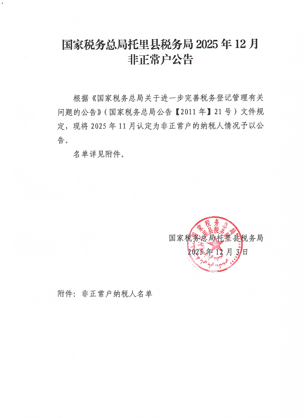 国家税务总局托里县税务局2025年12月非正常户公告 来源:国家税务总局托里县税务局 发布时间:2025-12-03 18:20:25 浏览次数: 次 附件:非正常户纳税人名单.pdf 相关内容 分享到: 【打印正文】