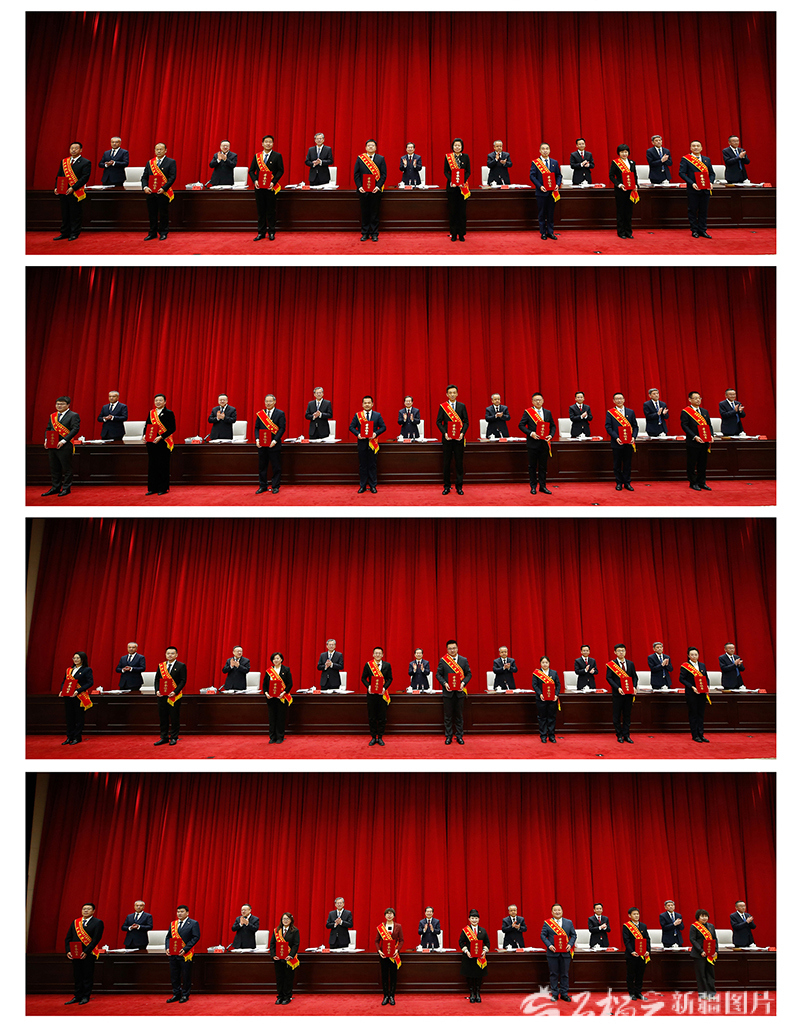 会上,自治区党委书记陈小江,自治区党委副书记、自治区主席艾尔肯·吐尼亚孜等领导为获得“新疆杰出人才奖”的代表颁发荣誉证书。天山网-新疆日报记者 谢龙摄