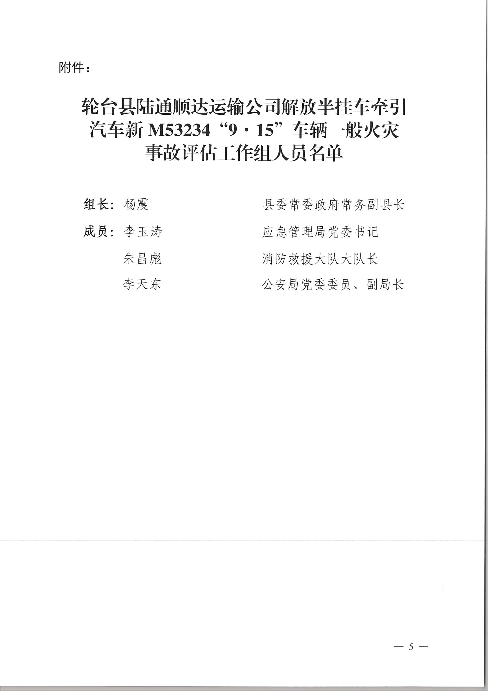 根据国务院安委办《生产安全事故防范和整改措施落实情况评估办法》规定,2024年9月15日,托里县人民政府成立轮台县陆通顺达运输公司解放半挂车牵引汽车新M53234“9·15”车辆一般火灾事故评估工作组(以下简称“事故评估组”),对该起事故的整改措施落实情况开展评估,评估结果如下。