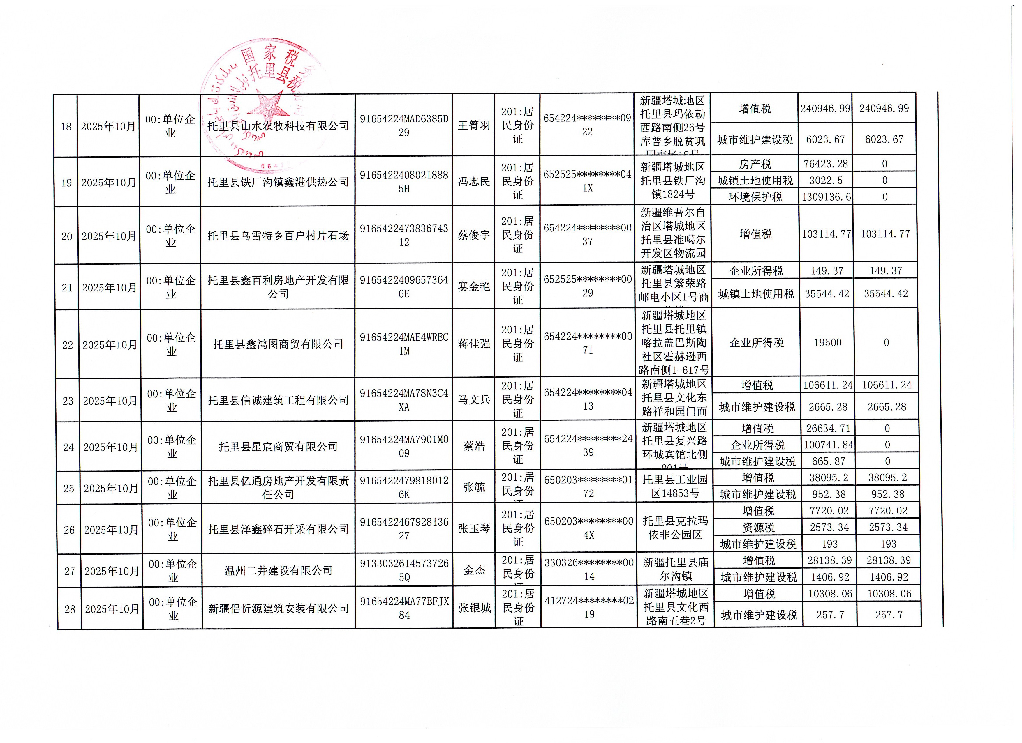 索引号: 001/2025101300000002 发布机构: 生效日期: 2025-10-13 有效性: 文 号: 所属主题: 税收管理 欠税公告2025年第4号 来源:国家税务总局托里县税务局 发布时间:2025-10-13 19:30:08 浏览次数: 次 【字体:小 大】 附件:1.托里县税务局纳税人欠税情况清册.jpg2.托里县税务局纳税人欠税情况清册.jpg3.托里县税务局纳税人欠税情况清册.jpg4.托里县税务局纳税人欠税情况清册.jpg 相关内容 【打印正文】 分享到: