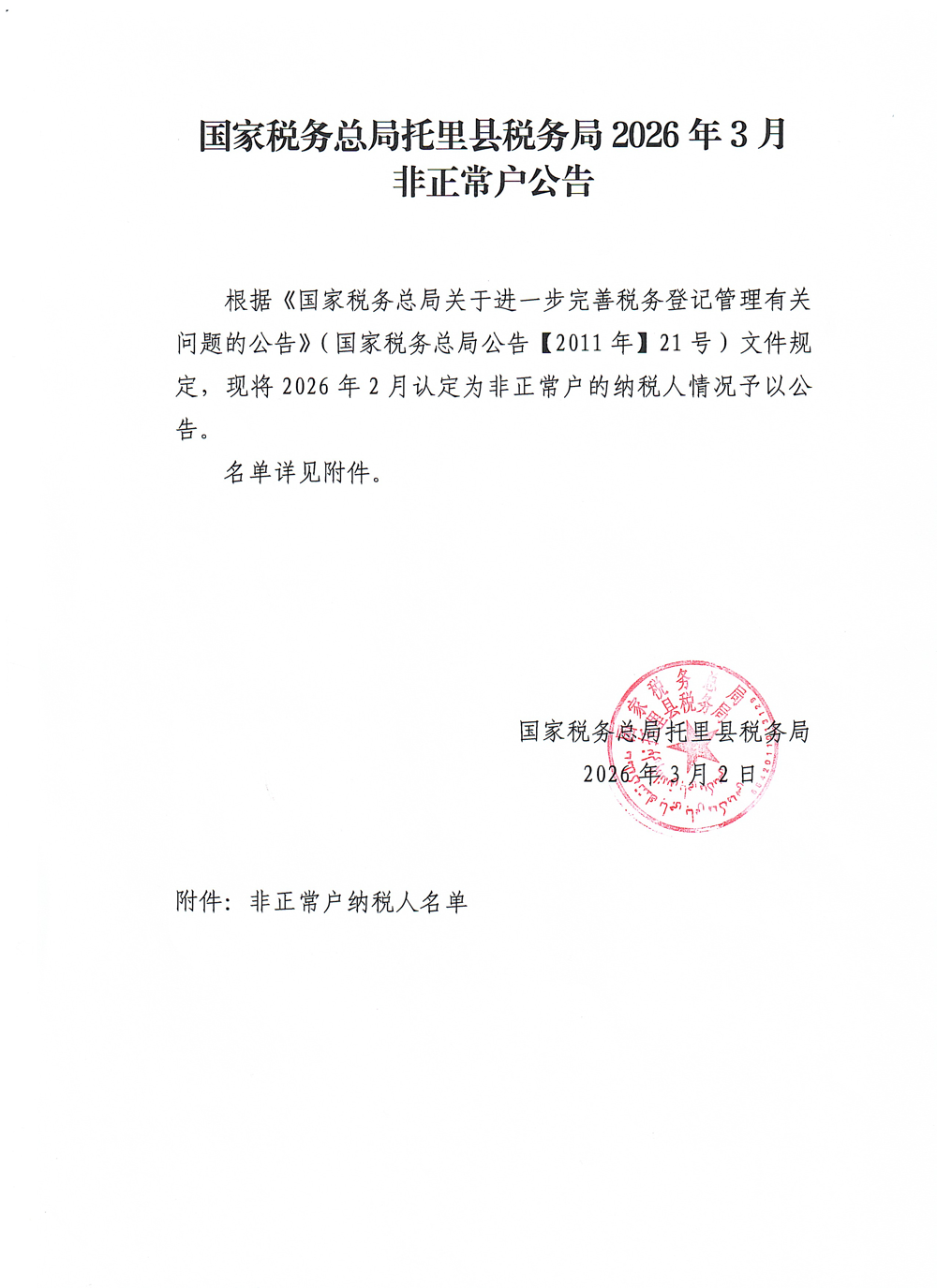 索引号: 001/2026030200000004 发布机构: 生效日期: 2026-03-02 有效性: 文 号: 所属主题: 税收管理 国家税务总局托里县税务局2026年3月非正常户公告 来源:国家税务总局托里县税务局 发布时间:2026-03-02 18:29:08 浏览次数: 次 【字体:小 大】 附件:非正常户纳税人名单(企业或单位).pdf 相关内容 【打印正文】 分享到: