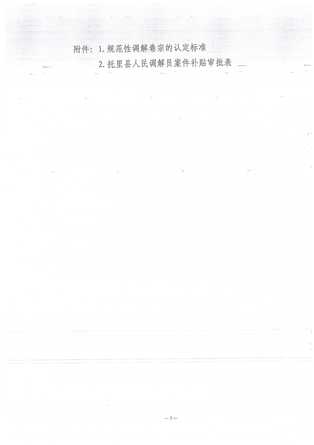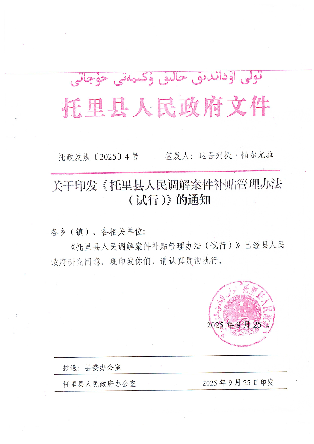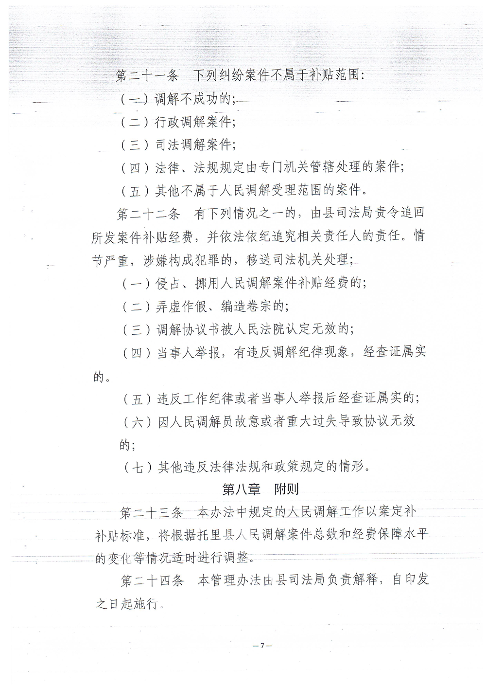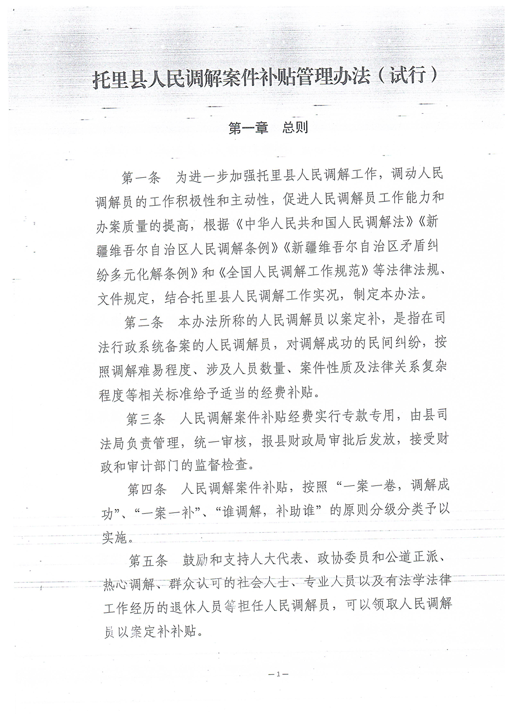 索引号: 001/2025101000000009 发布机构: 生效日期: 2025-10-10 有效性: 现行有效 文 号: 托政发规〔2025〕4号 所属主题: 行政规范性文件 关于印发《托里县人民调解案件补贴管理办法(试行)》的通知 来源:托里县司法局 发布时间:2025-10-10 19:12:14 浏览次数: 次 【字体:小 大】 相关解读:托里县人民调解案件补贴管理方法(试行)制定说明.pptx 相关内容 关于托里县人民调解案件补贴管理办法(试行) 的 政策解读 【打印正文】 分享到: