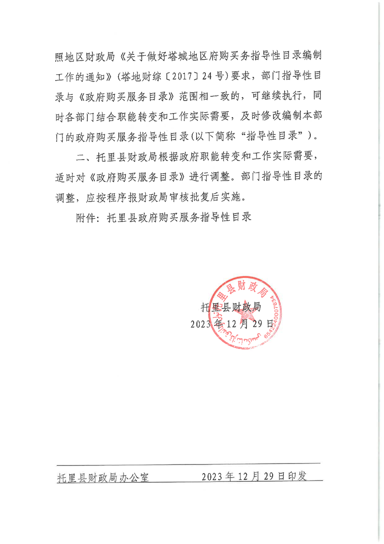 索引号: 6542240010/20231229-00000119 发布机构: 托里县财政局 生效日期: 2023-12-29 有效性: 现行有效 文 号: 所属主题: 政府信息公开目录 关于印发《托里县政府购买服务指导性目录》的通知 来源: 发布时间:2023-12-29 12:11:10 浏览次数: 次 【字体:小 大】 【打印正文】 分享到: